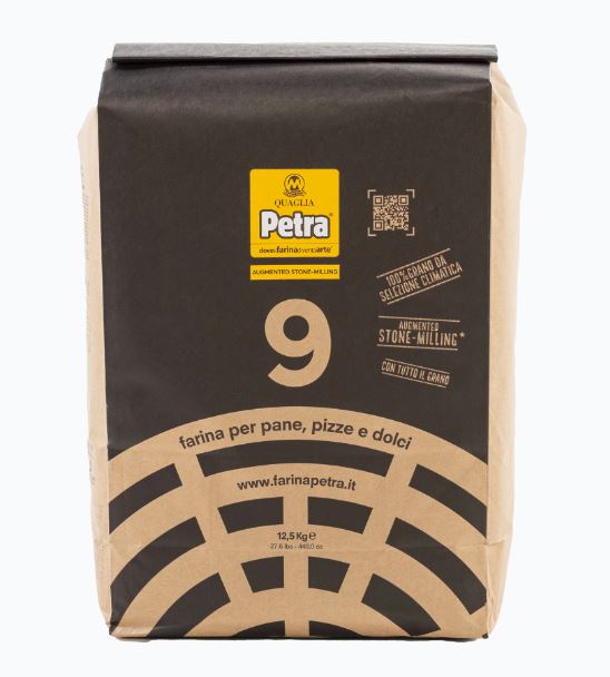 La Petra 9 è una farina di grano tenero 100% da selezione climatica, macinata a pietra con l'innovativo processo augmented stone milling per una selezione ottica perfetta del grano e la setacciatura e calibrazione controllata nell'impianto molitorio industriale più avanzato d'Italia. Una farina più completa fonte di fibre nobili e con un contenuto equilibrato delle parti diverse del chicco compreso il germe di grano.